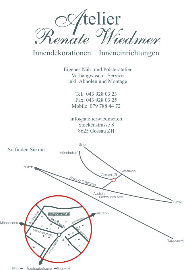 Mit SBB (S3, S5, S14) nach Wetzikon, Bus Nr. 862 bis Haltestelle Gossau „Mitteldorf“, zu Fuss ca. 10 min zum Atelier.